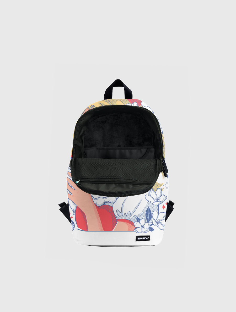 Handmade to order, this versatile backpack has a modern shape and a vivid front, top and side print.. Inside, a 15inch laptop compartment and mesh organizer. Outside, Side Zipper Pockets. Comes with "SPARK" engraved zipper tags.